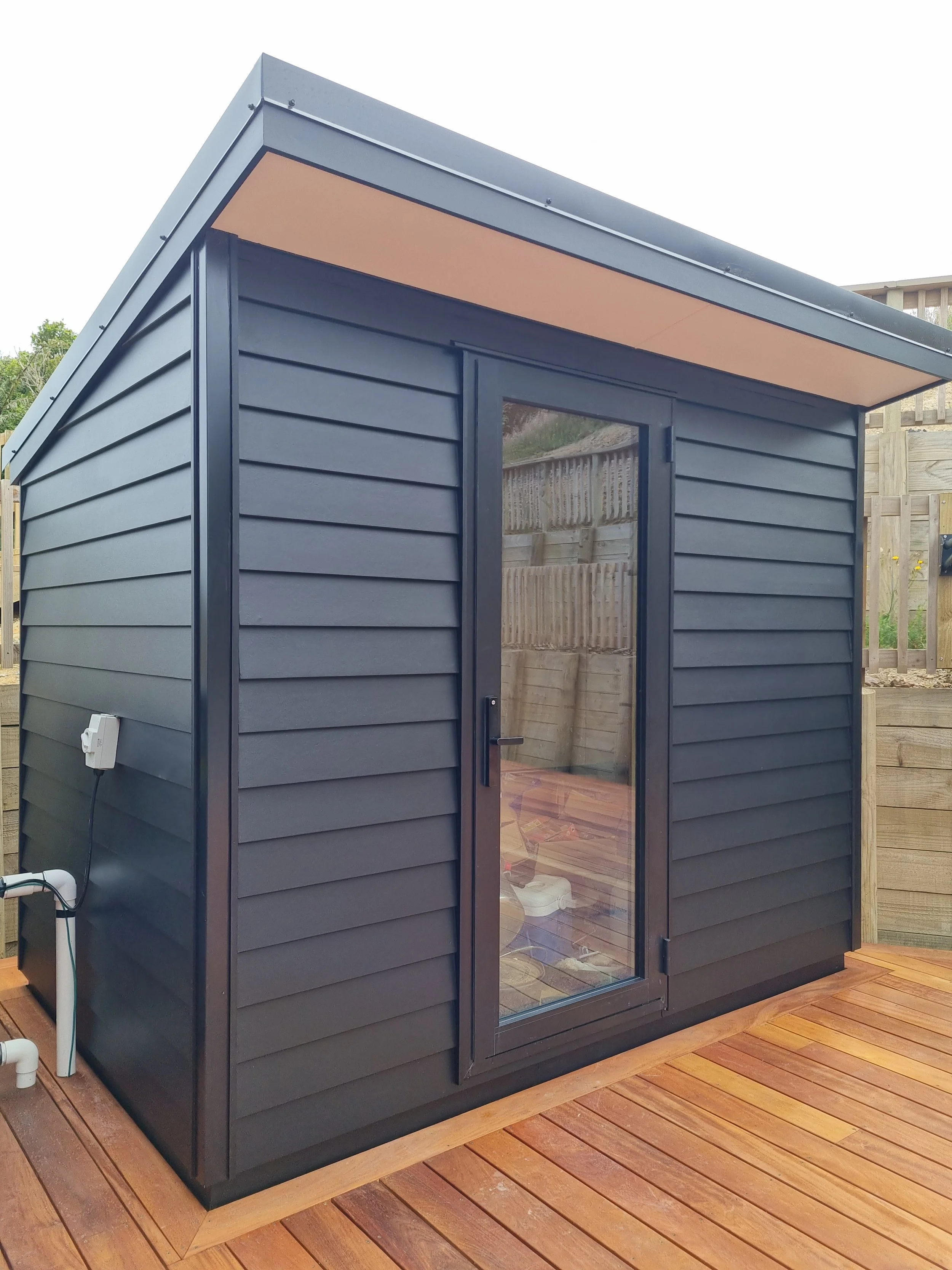 Our custom sheds are designed and built to match your exact needs. Choose size, layout, roof style, colour, door and window placement, insulation, and interior finishes. Add electrical, lighting, shelving, workbenches, and heating options for a workshop, home office, or hobby room.